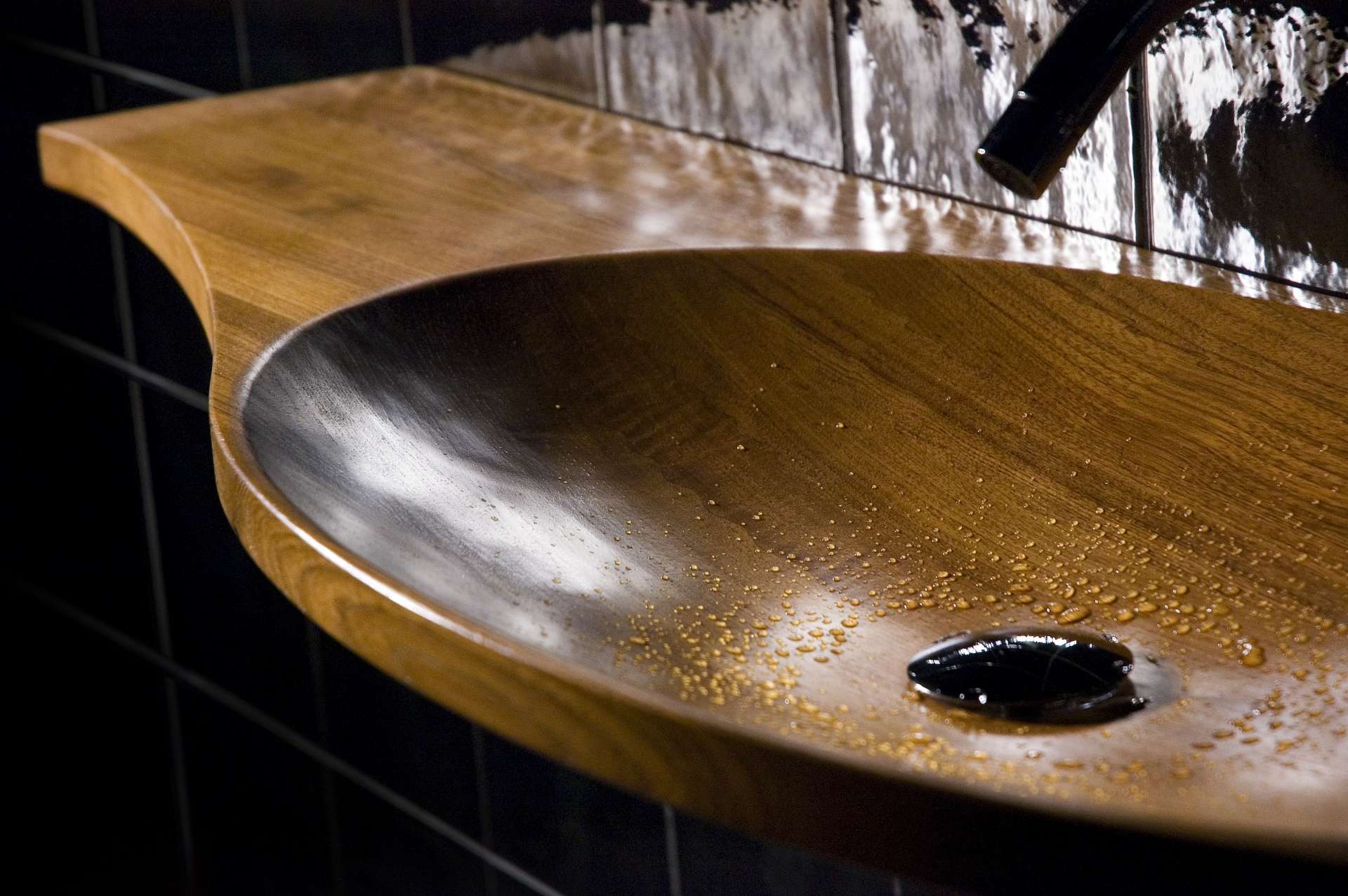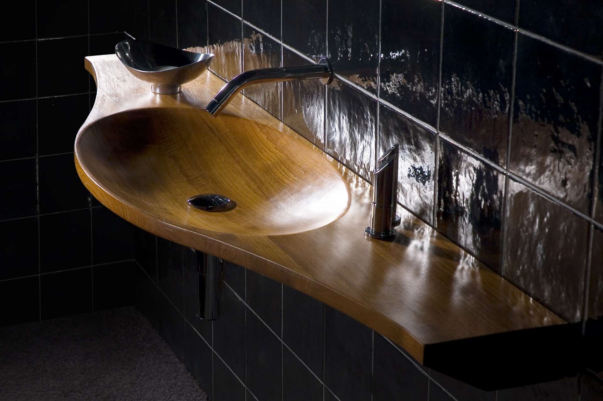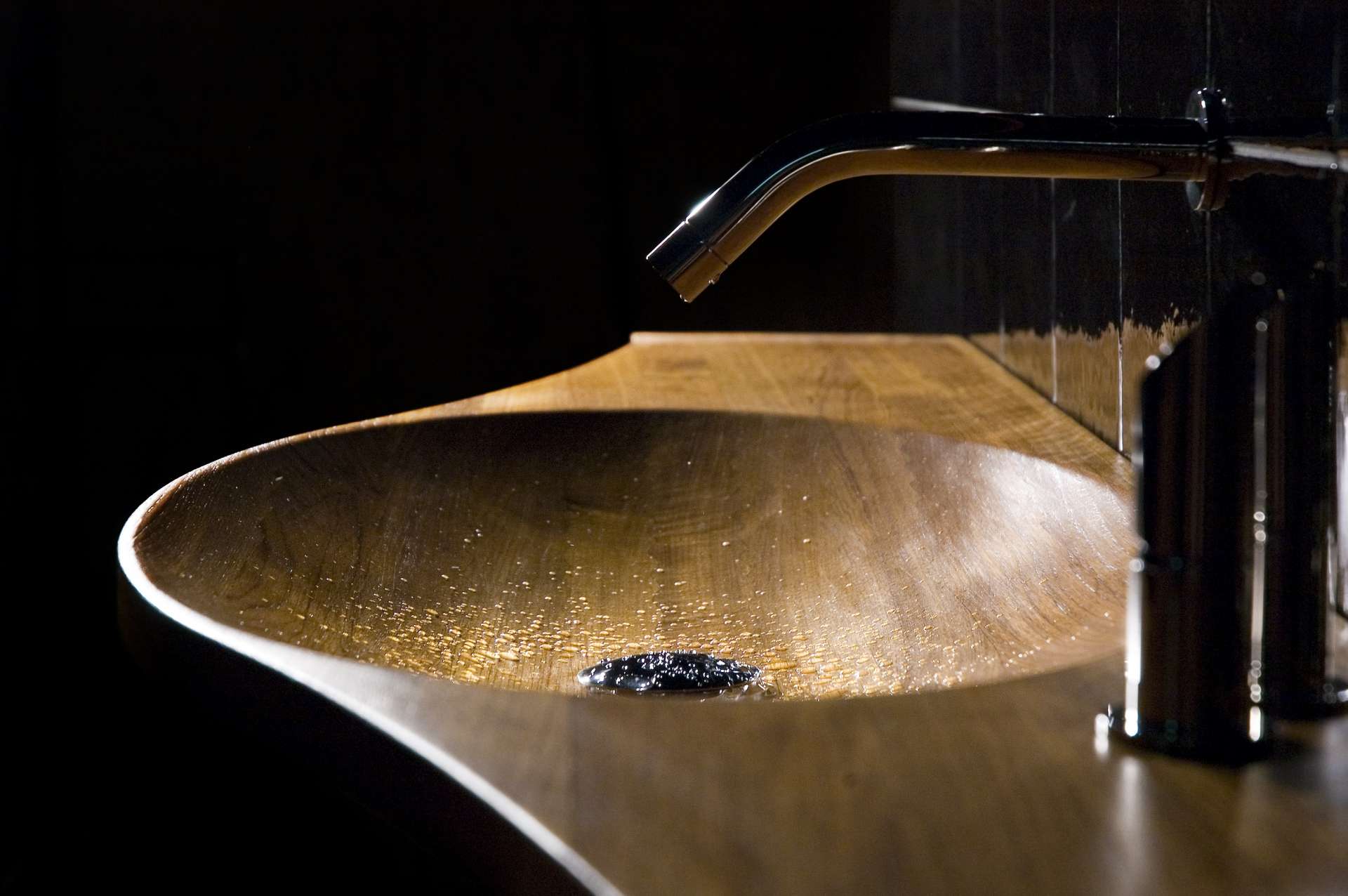 Decorative suspended washbasin in shaped Burmese Teak, with oval, dug, single or double basin and connected edges. Composed of pre-assembled blocks, joined with the special "finger joint" technique, characterized by a new and unique design. Washbasin without overflow and without holes, can be matched with column or wall taps and controls on basin border (with holes upon request). Uses drain 063 GO including round plug (permanently open plug)