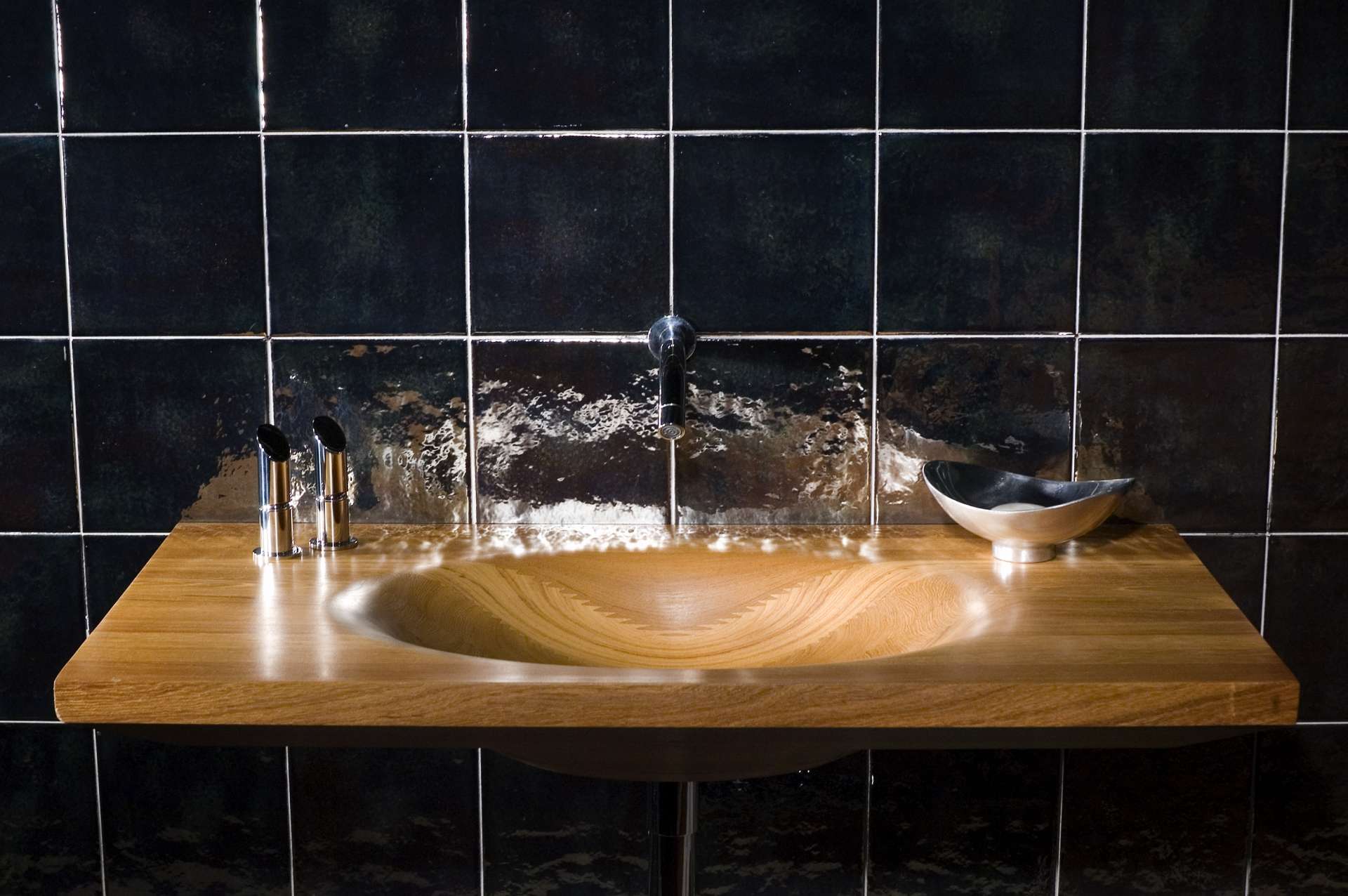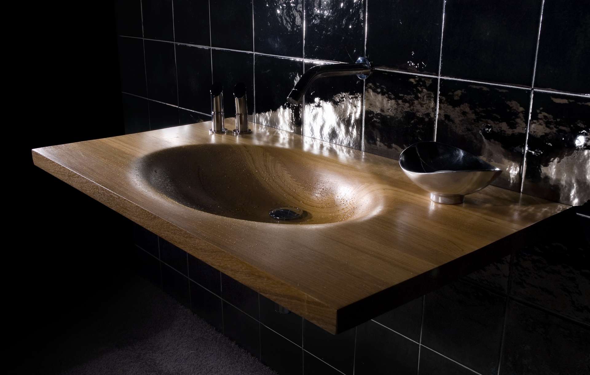 Decorative suspended washbasin in shaped Burmese Teak, with oval, dug, single or double basin and connected edges. Composed of pre-assembled blocks, joined with the special “finger joint” technique, characterized by a new and unique design. Washbasin without overflow and without holes, can be matched with column or wall taps and controls on basin border (with holes upon request).Uses drain 063 GO including round plug (permanently open plug). Can be accessorized with tissue holder.