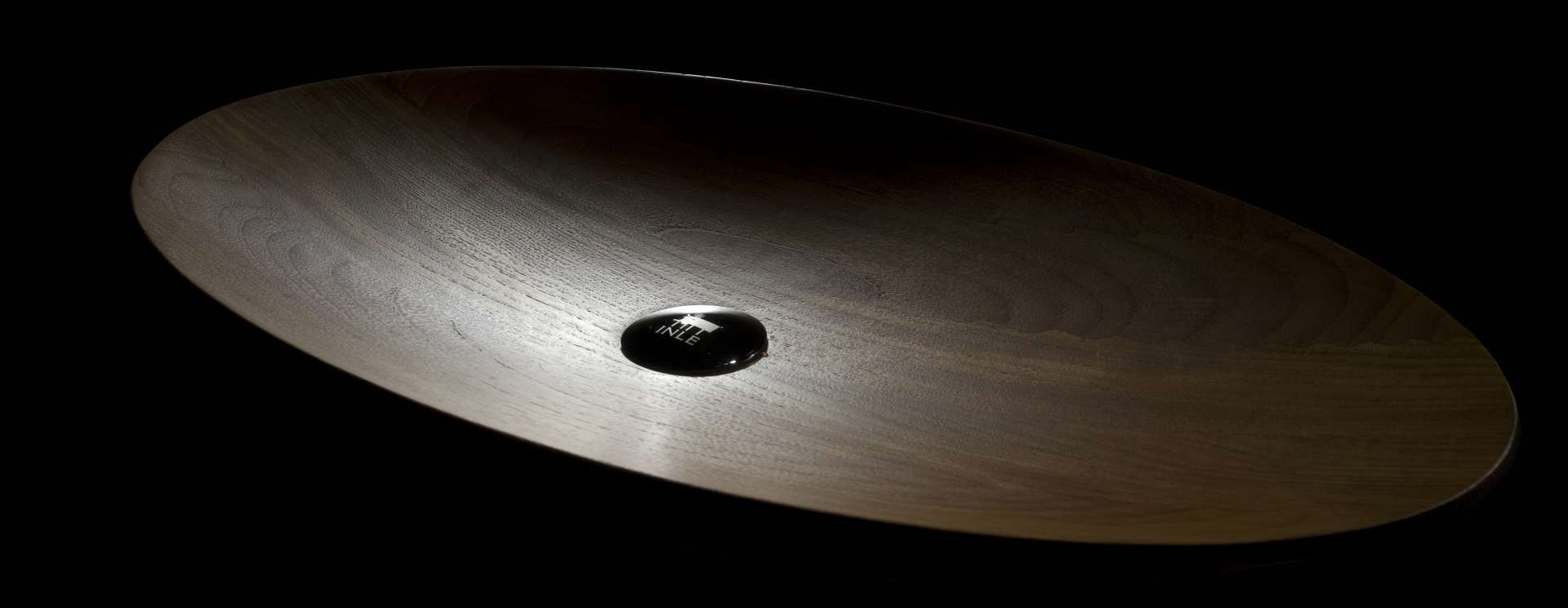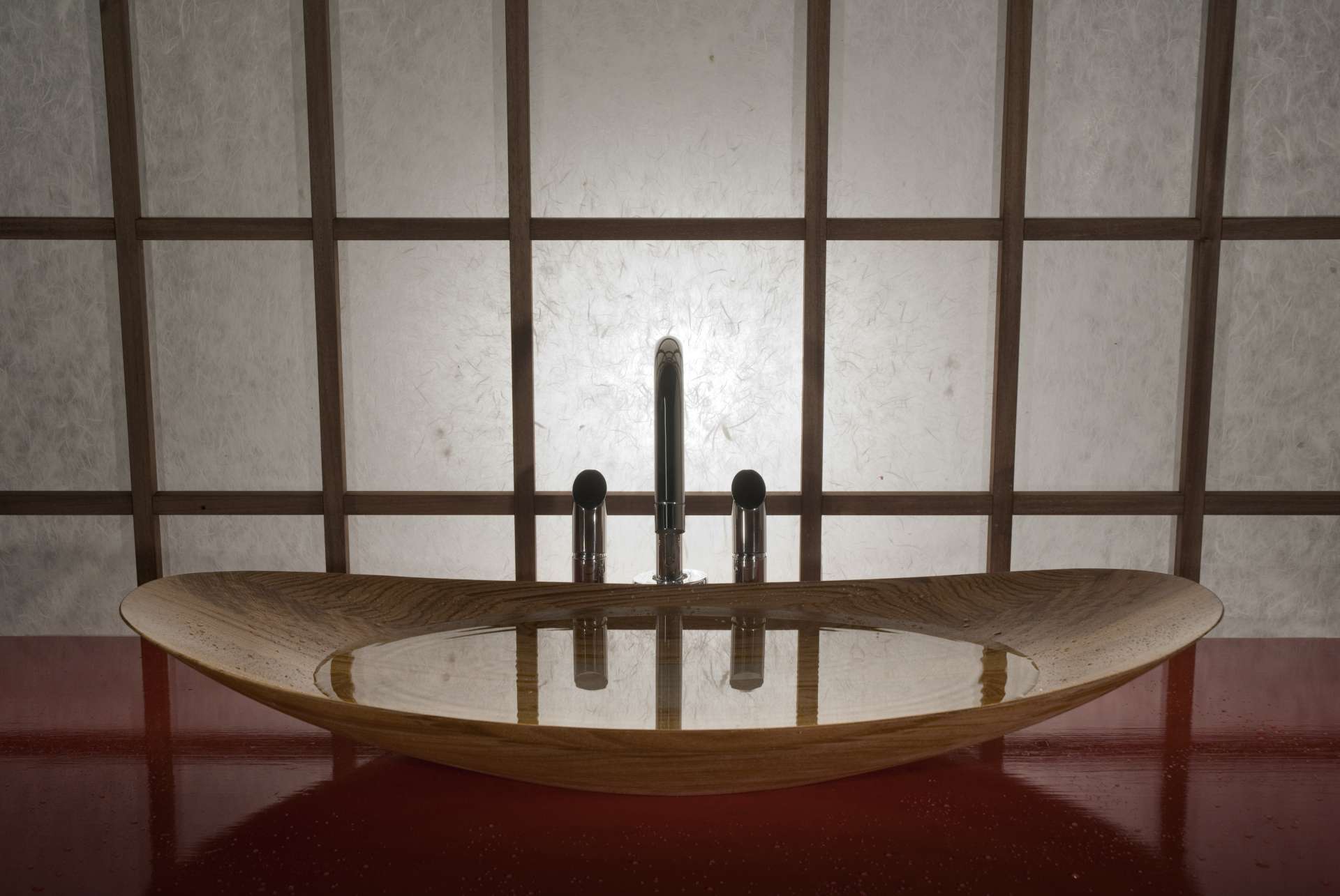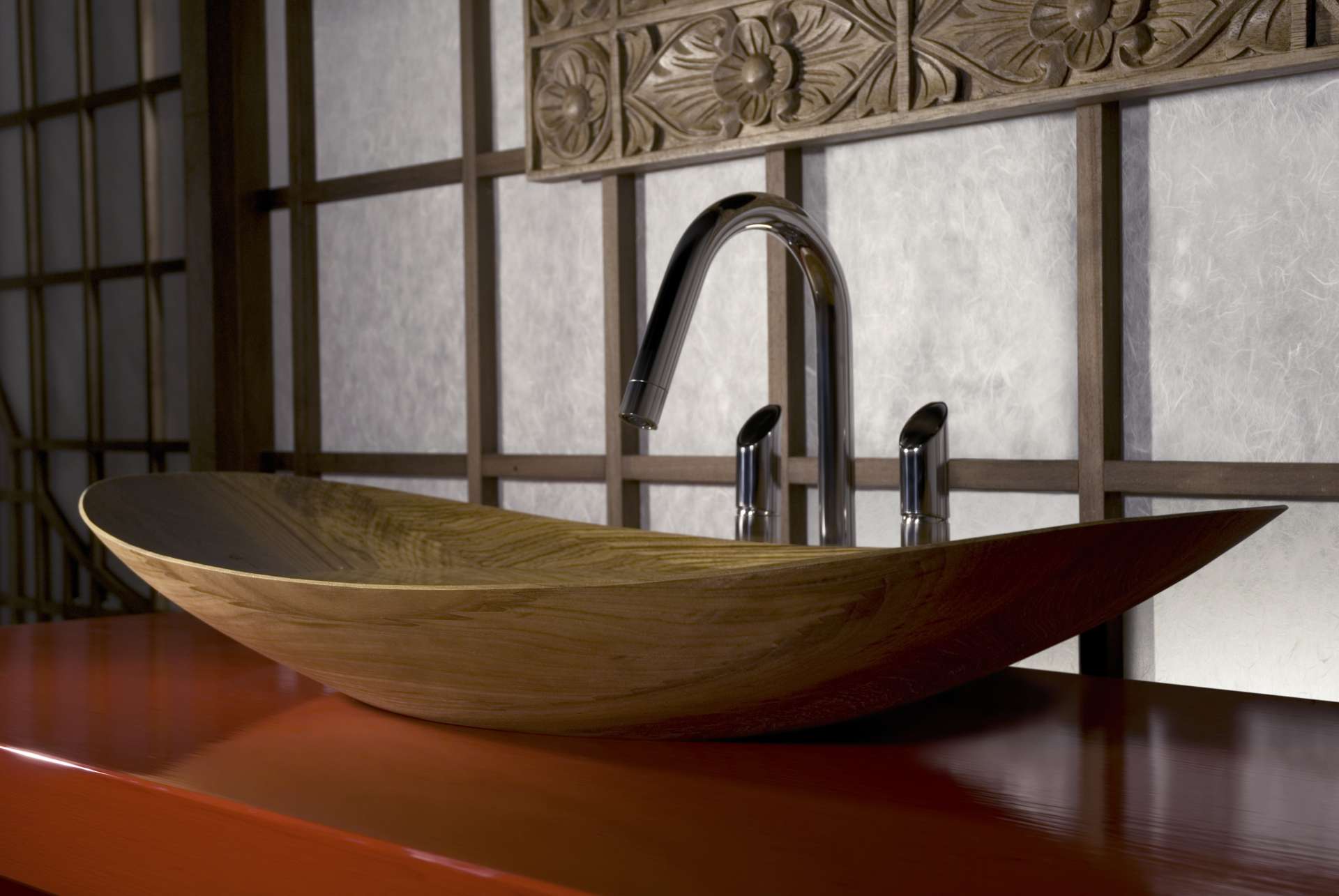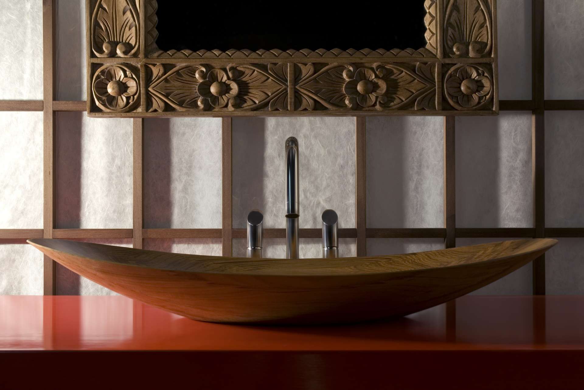 Oval standing washbasin with gondola shaped profile in Burmese Teak without overflow, can be paired with wall taps or taps on border of basin on top. Uses drain 063 GO including round plug (permanently open plug).